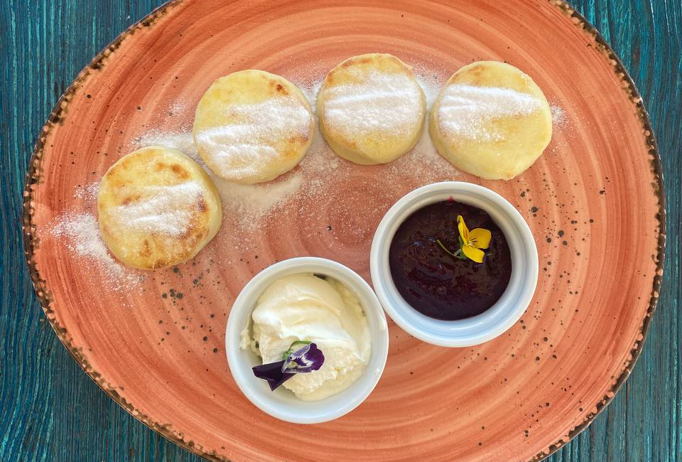 Сырники из фермерского творога со сметаной и ягодными кюли