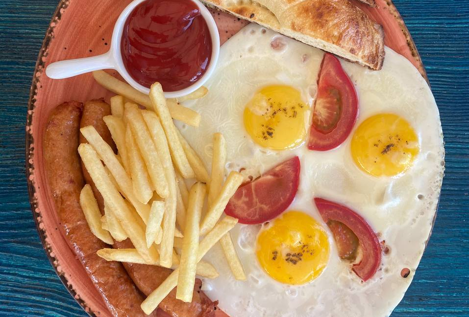 Английский завтрак из 3-х яиц с домашними колбасками, томатами, тостами, картофелем фри