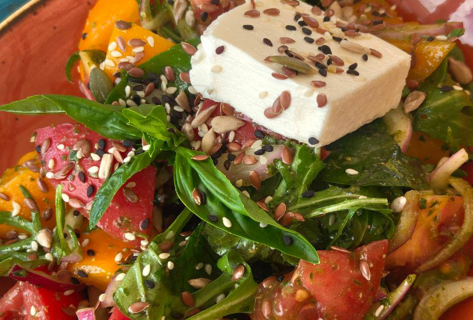 Крымские томаты с ялтинским луком, кунжутом и домашней соленой брынзой